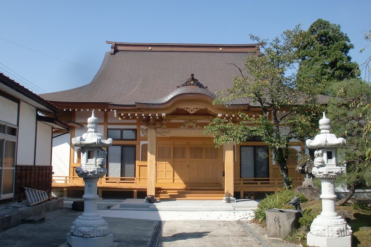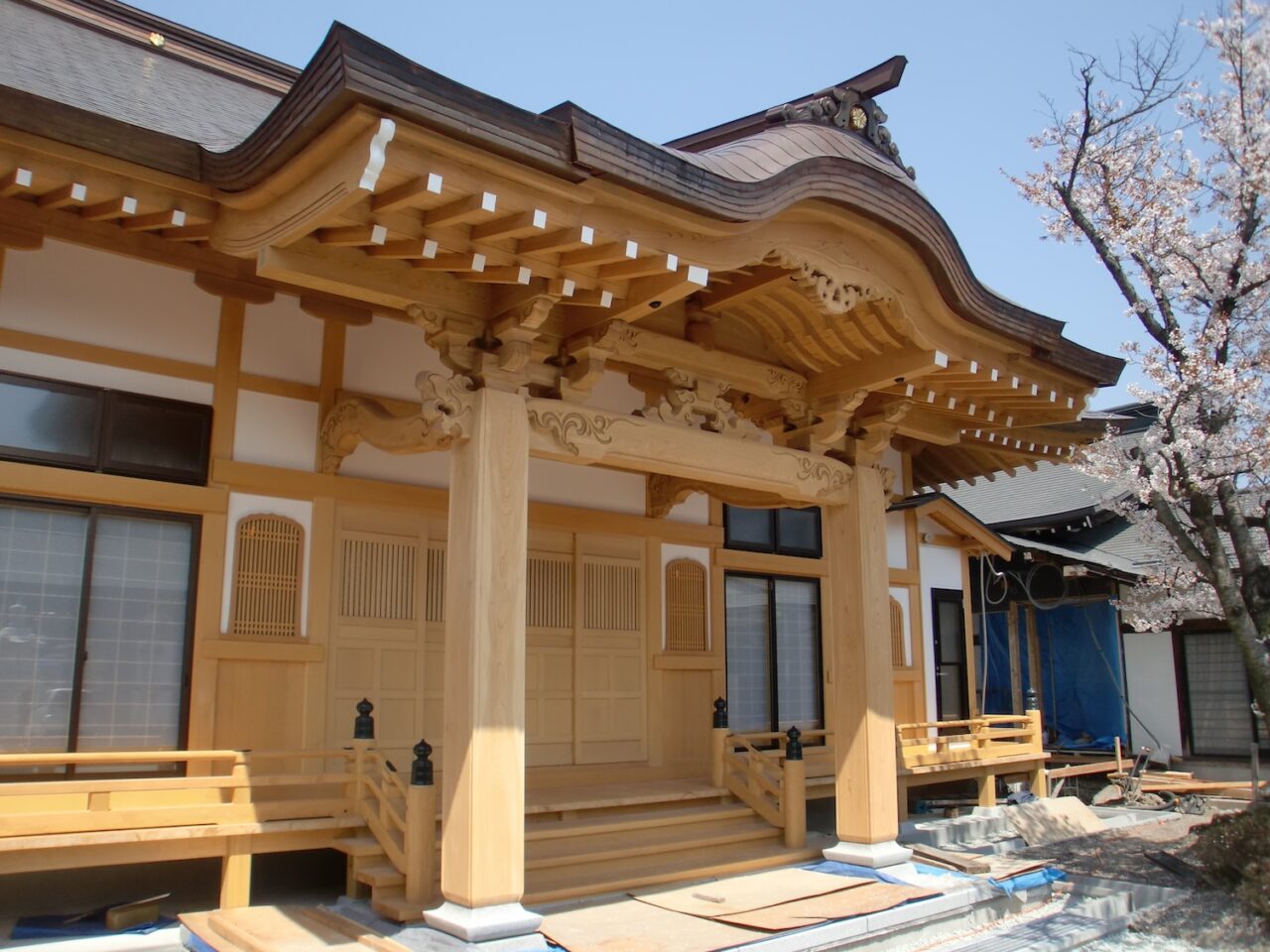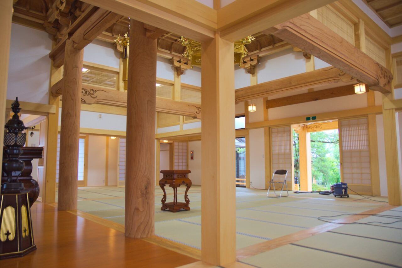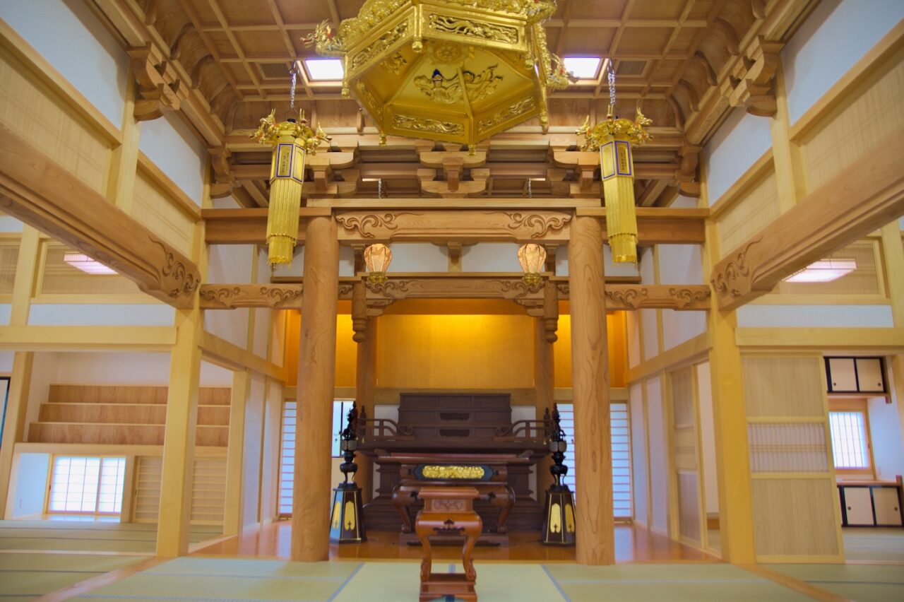 すべての柱材にヒバの芯去材を使用。屋根は軒唐破風仕上げとし、力強さと流麗さが調和した立派な本堂となりました。