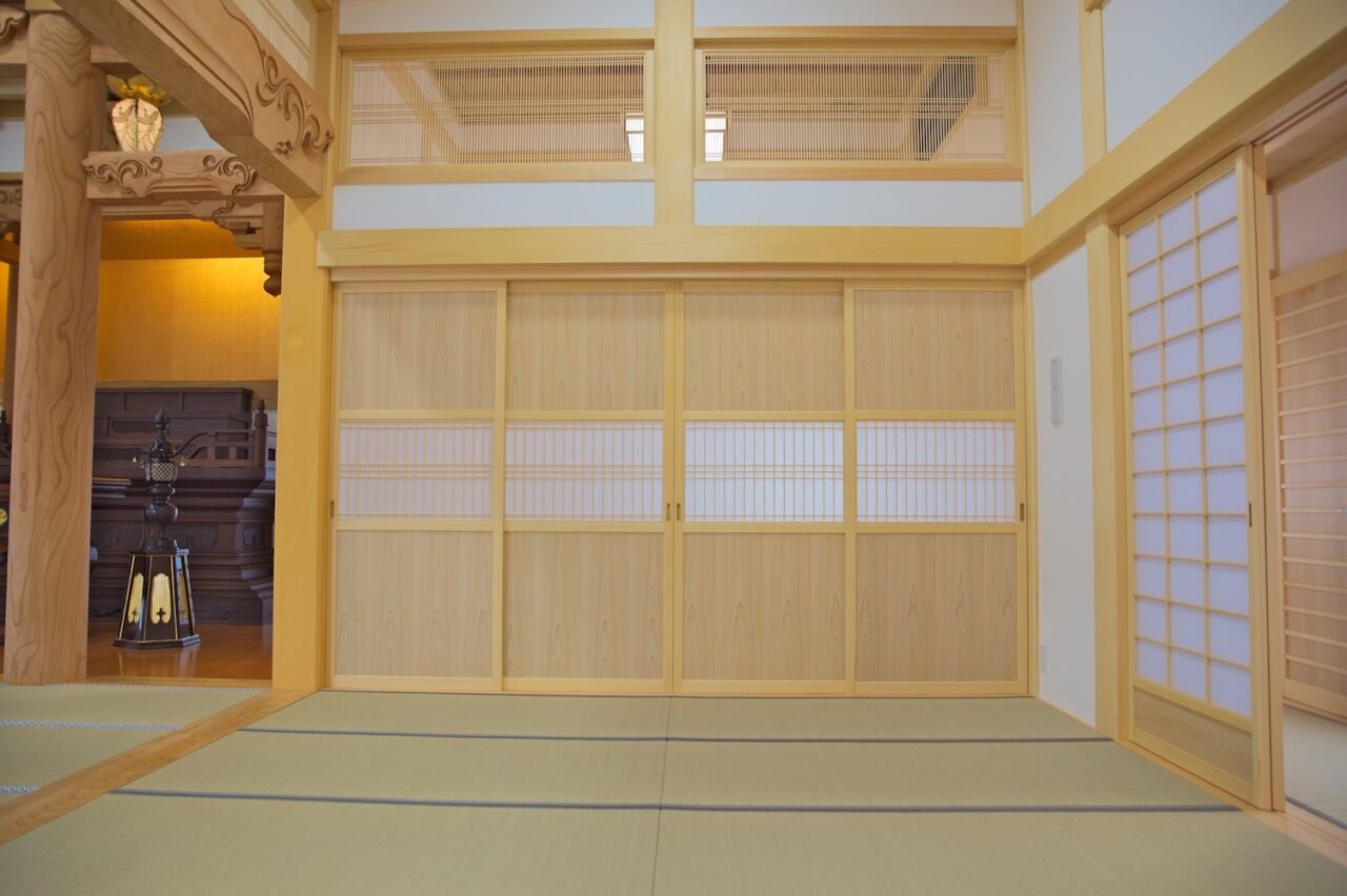 大間の折上げ格天井の天井板には無垢の秋田杉板を使用しており、なんともいい香りが本堂全体に漂います。