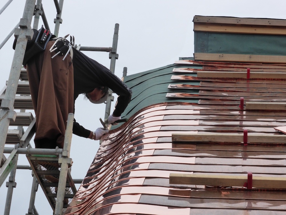 屋根は当社特許商品「強化ハゼ一文字葺き」にて葺いていきます。入母屋(入母屋)の箕甲(みのこう)は、一枚一枚型を取って葺いています。優雅な曲線を出すのが職人の腕の見せ所です。