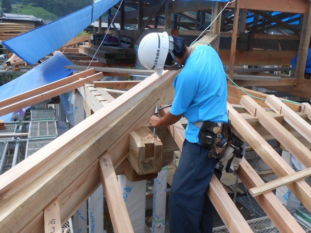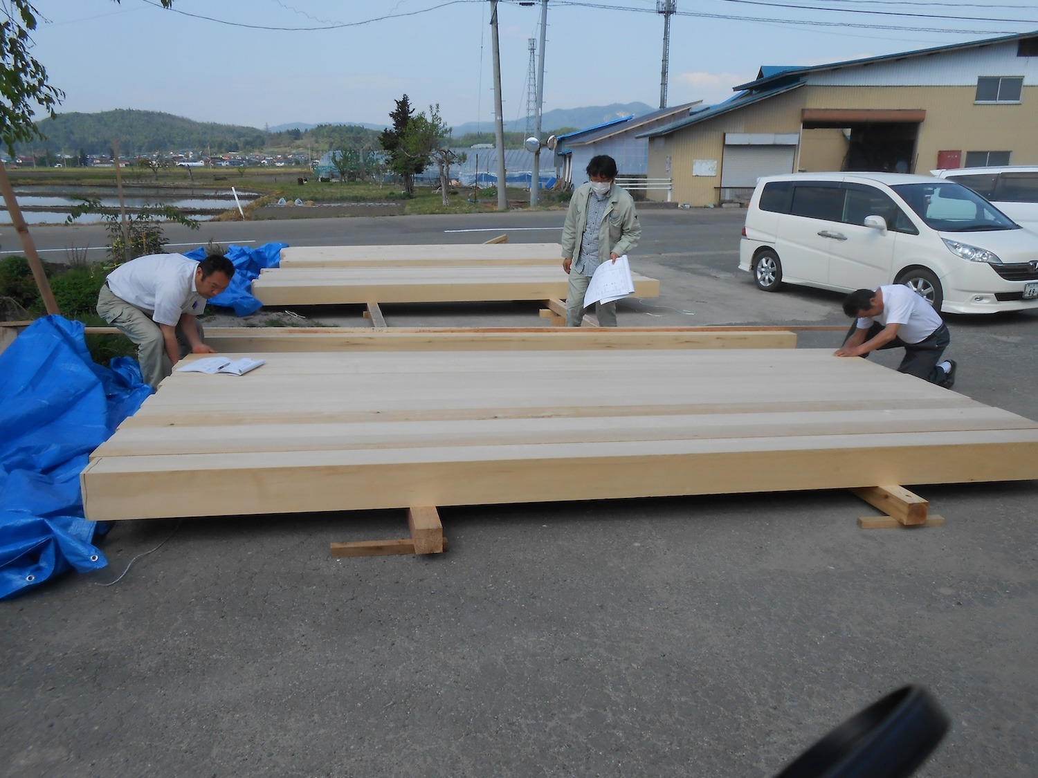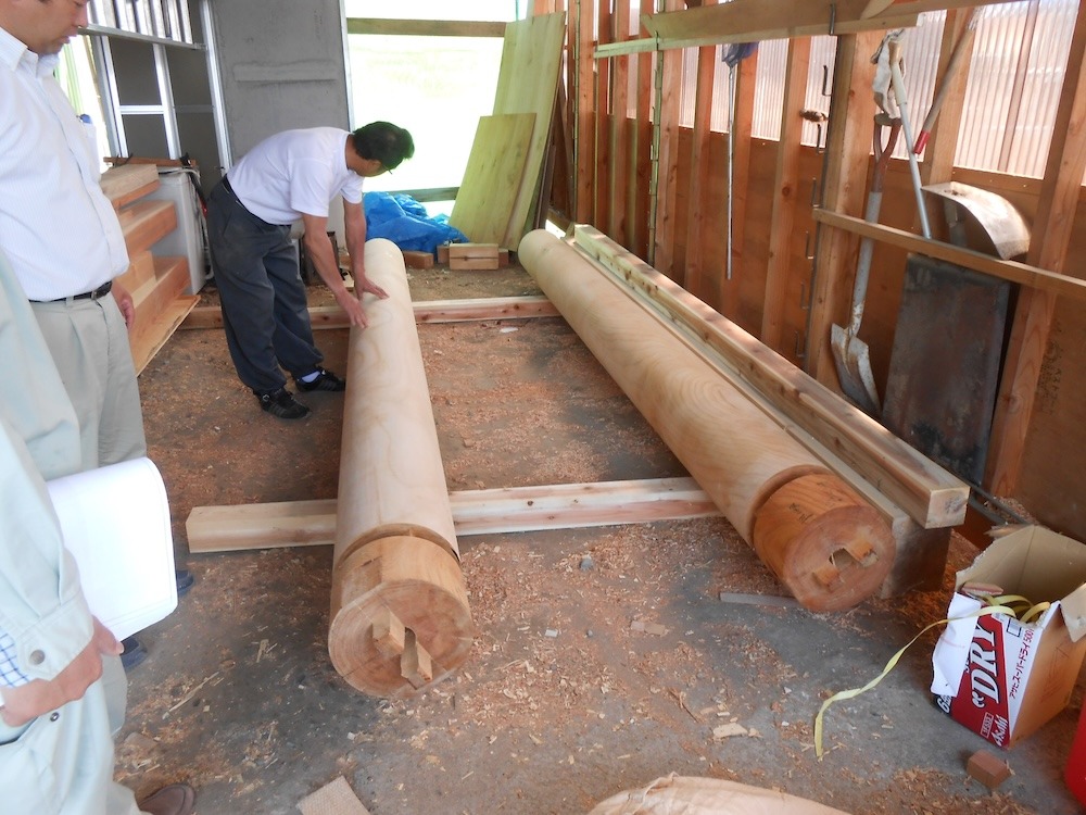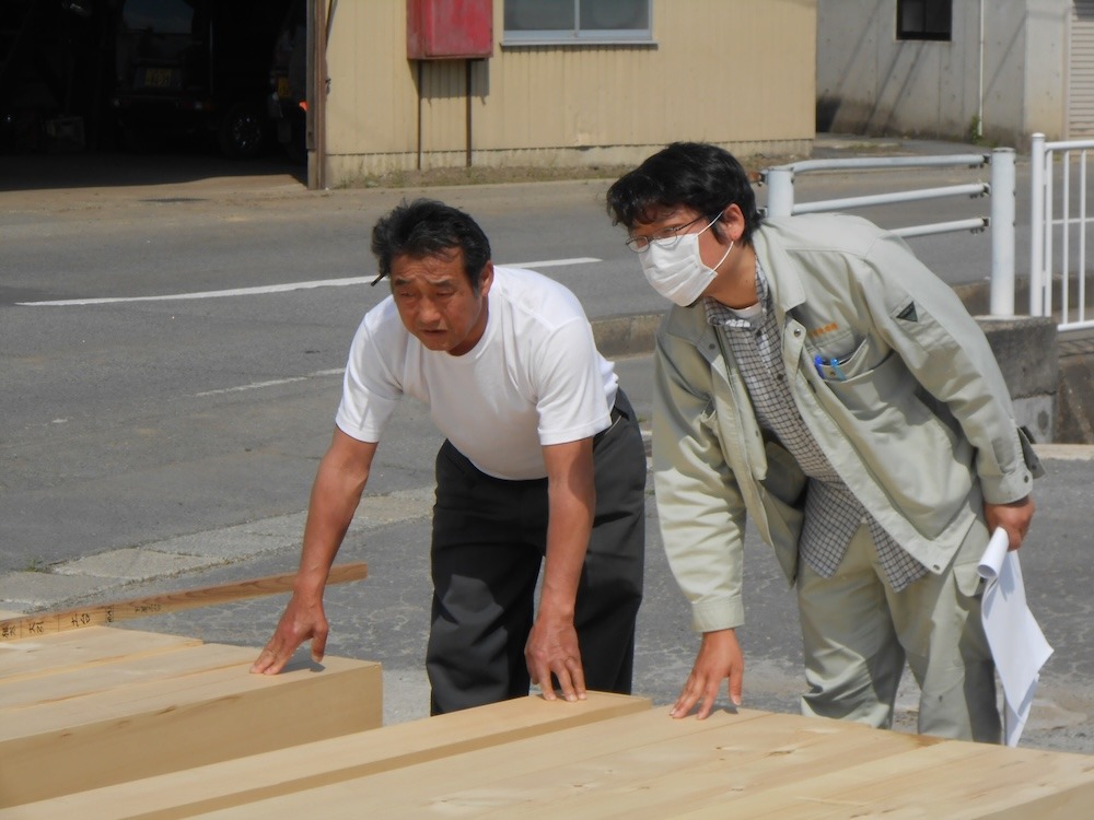 乾燥したヒバ材の柱をどこに使うか、どの面を出すかなど、棟梁と慎重に打ち合わせしていきます。