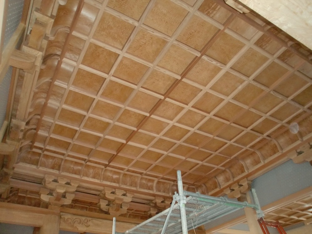 大間の折上げ格天井の天井板には無垢の秋田杉板を使用しており、なんともいい香りが本堂全体に漂います。