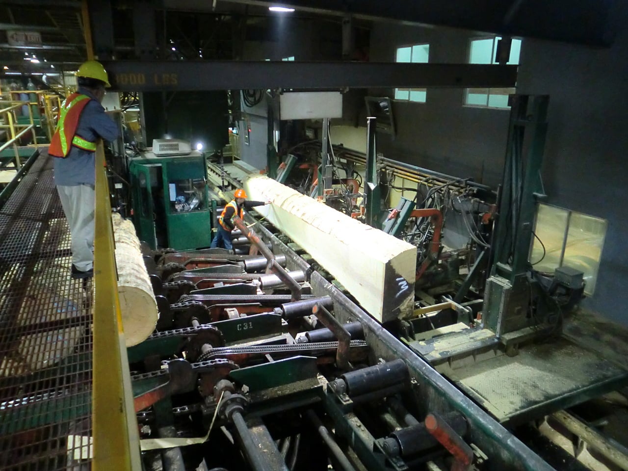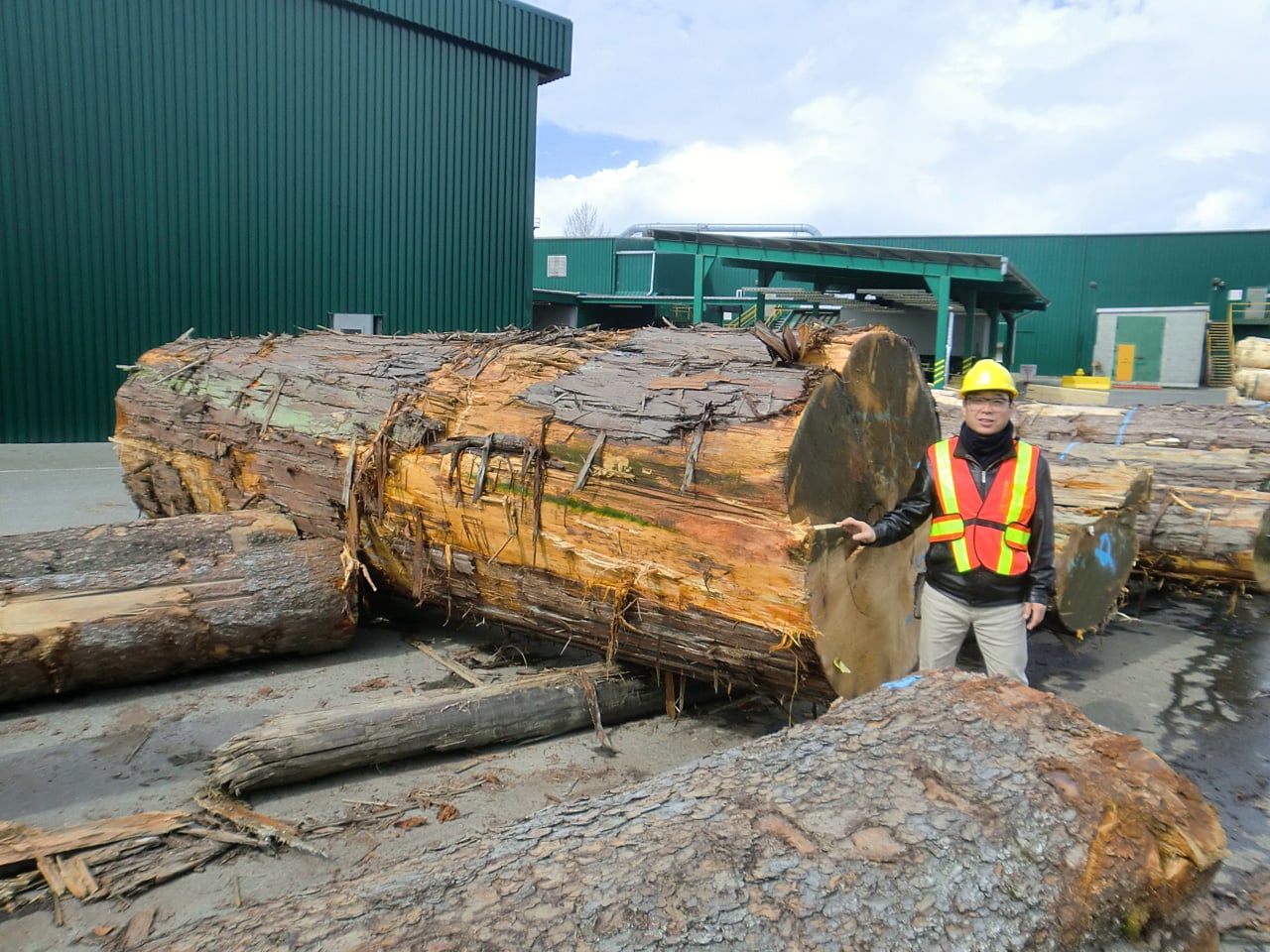 太いヒバ材の芯去り材の柱は国内では求めることができず、最終的にカナダから購入することになりました。バンクーバー郊外にあるカナダ最大手の製材会社へ出向き、樹齢800〜1000年にもなる米ヒバの丸太群を選定し、本堂の柱材を取ることにしました。熟練の技師が超大型の製材機を操り、巨大な丸太を次々と製材していきます。比べ物にならないほどのスケールの大きさです。