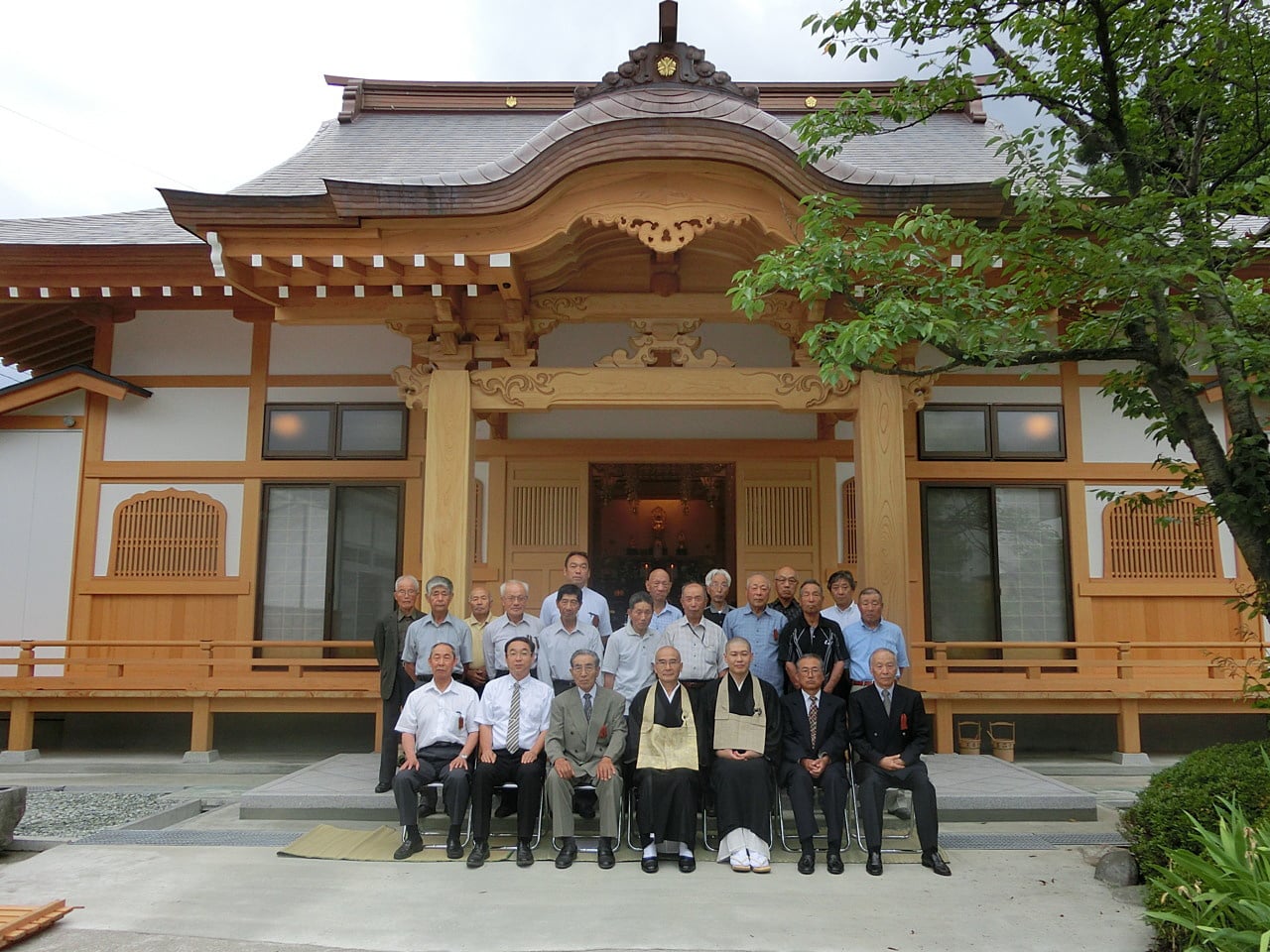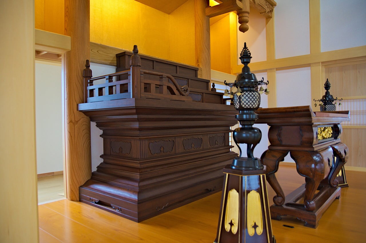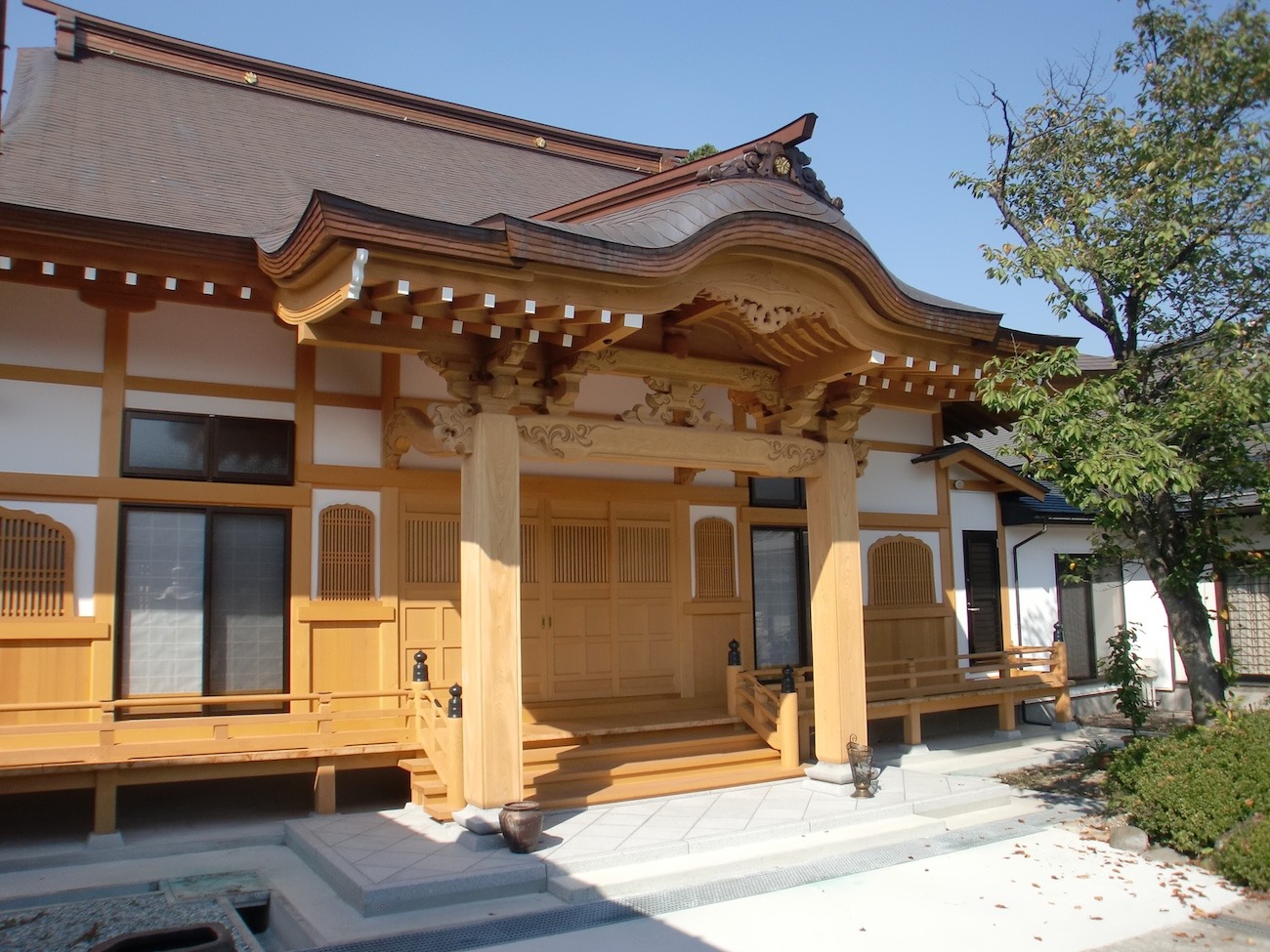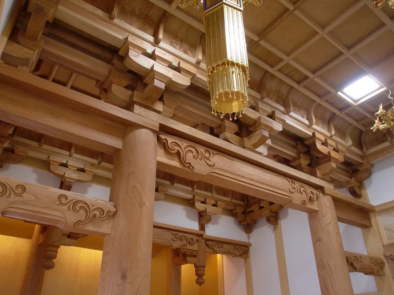 すべての柱材にヒバの芯去材を使用。屋根は軒唐破風仕上げとし、力強さと流麗さが調和した立派な本堂となりました。