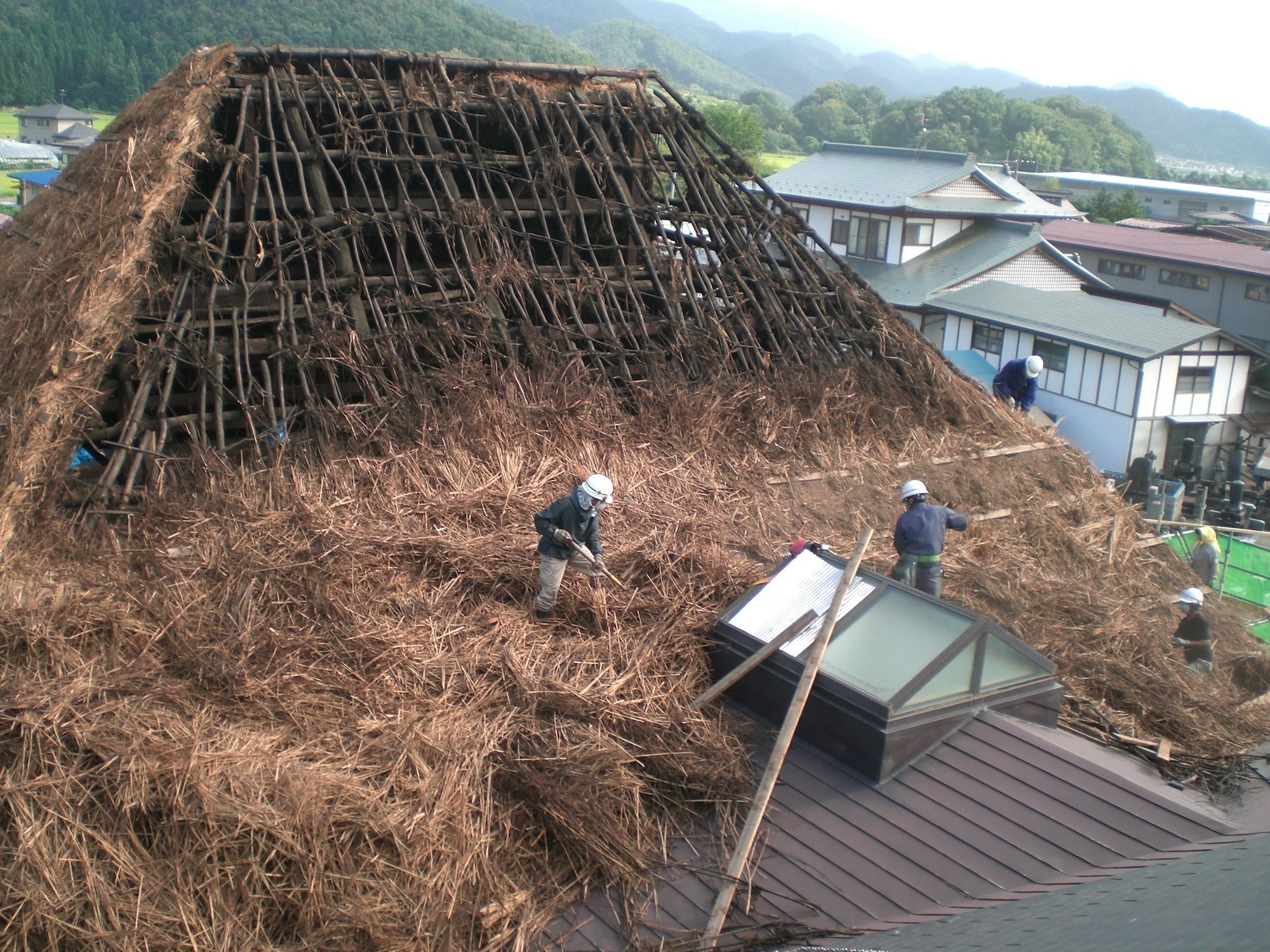 その後、古いトタンを剥がし、下地、茅屋根を手作業で解体していきます。