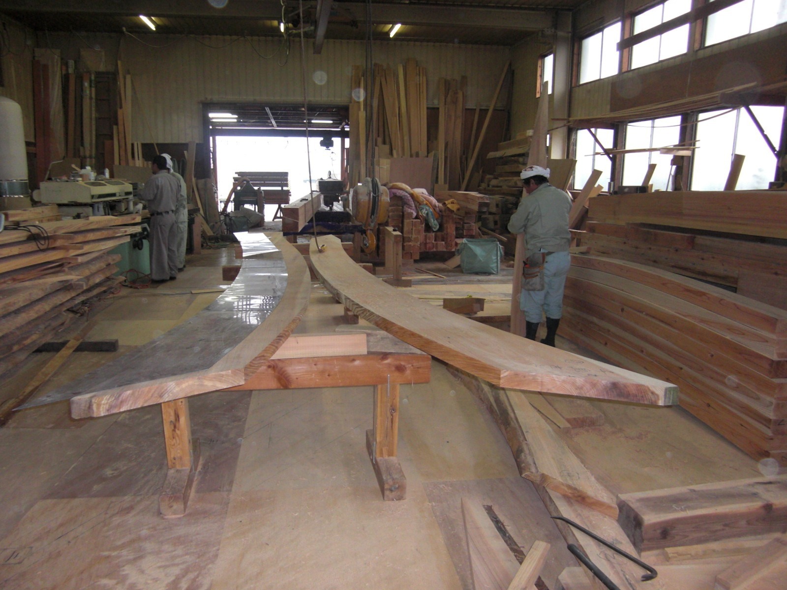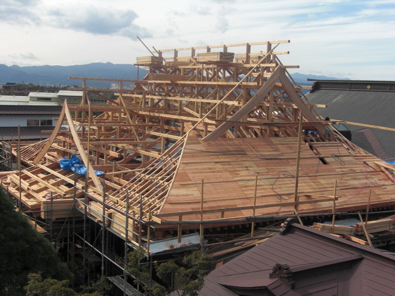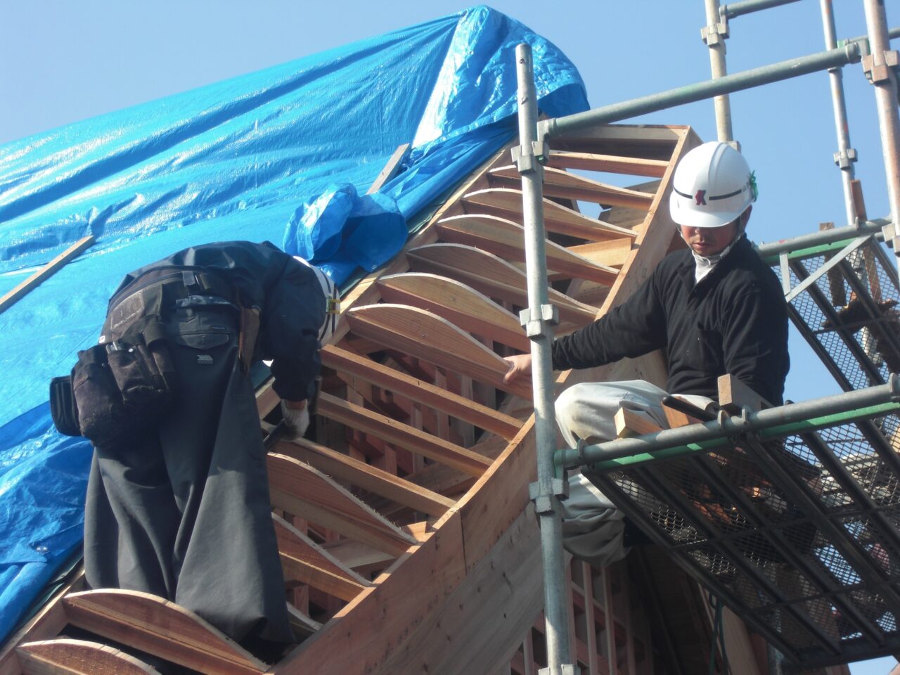 大型クレーンで太い桔木(はねぎ)を納めました。小屋組の全体が作られていきます。