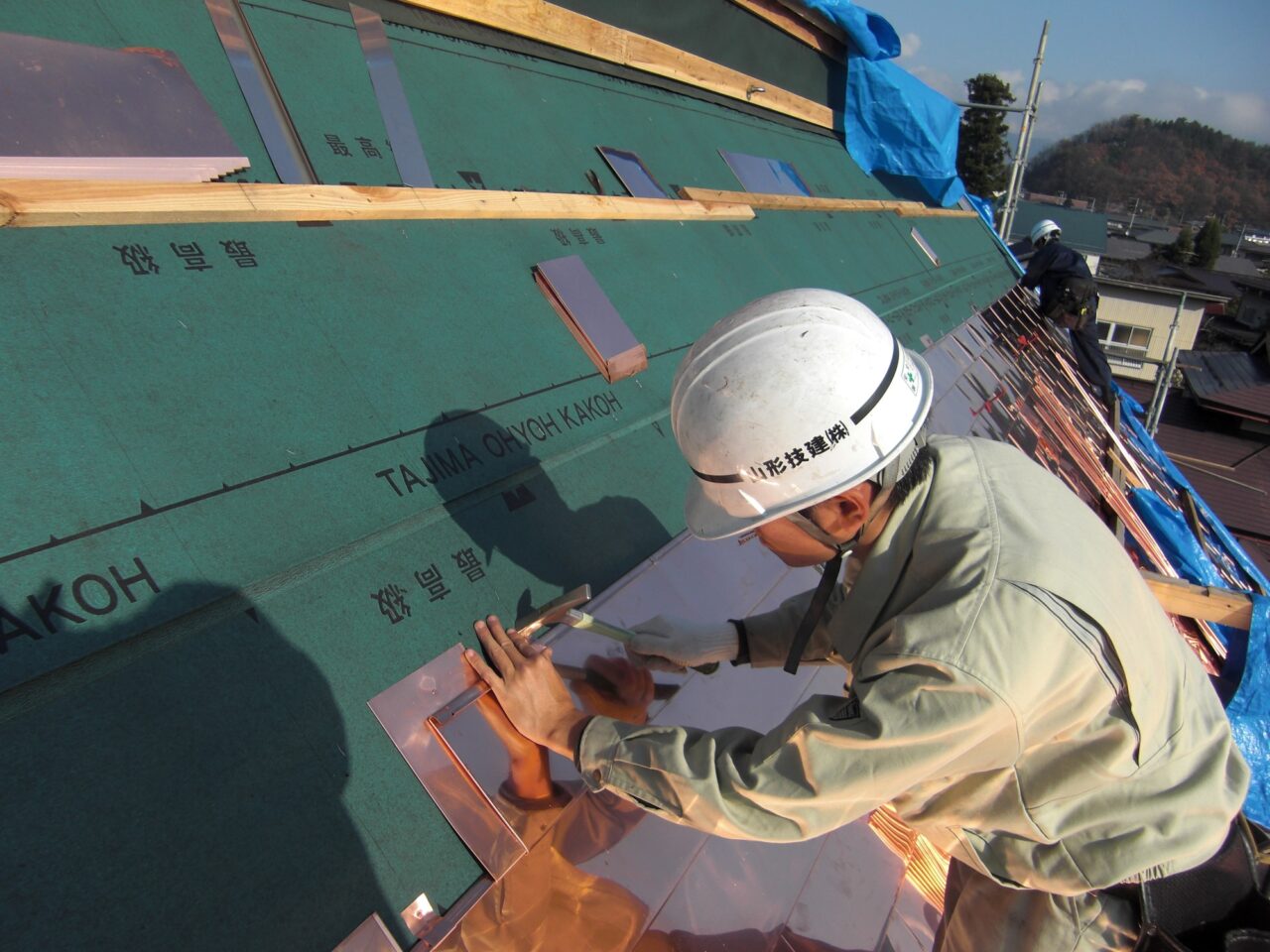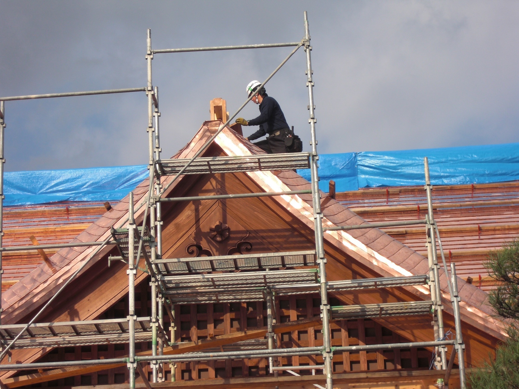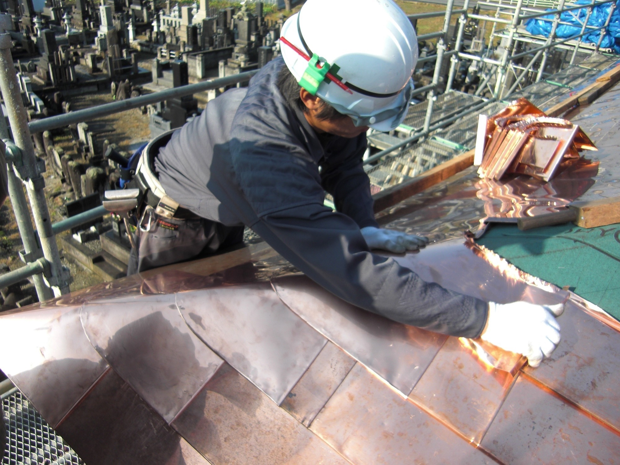 弊社特許『強化ハゼ銅版一文字葺き』を葺いていきます。箕甲、棟木、鬼飾り等を納めます。