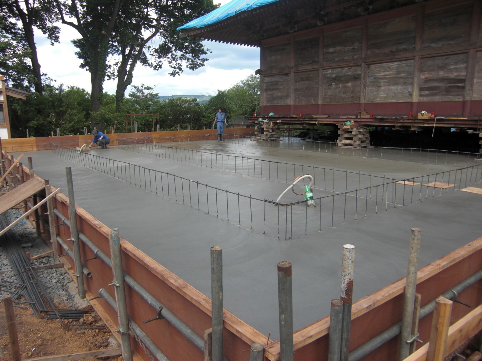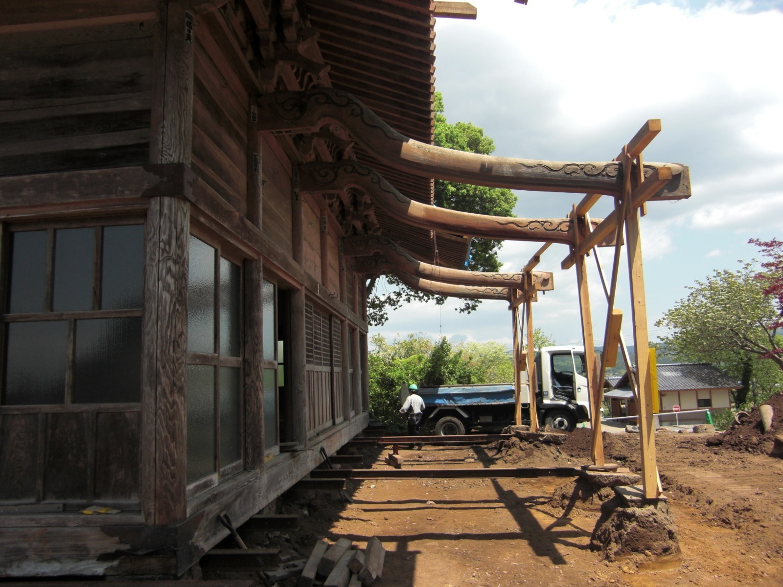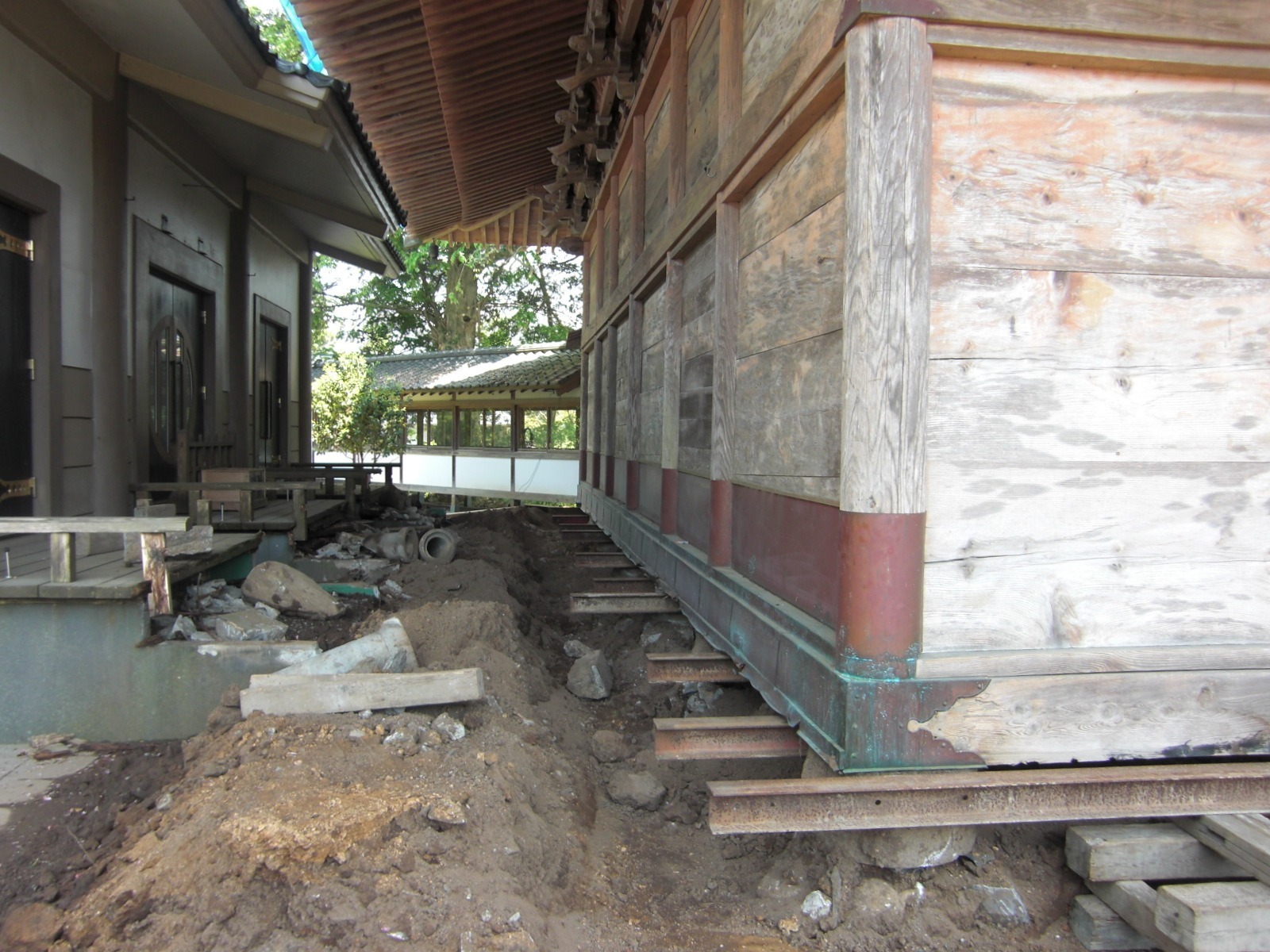 本堂は築50年と比較的新しいものの基礎が無く、年月を経て建物の傾きが顕著になってきていました。