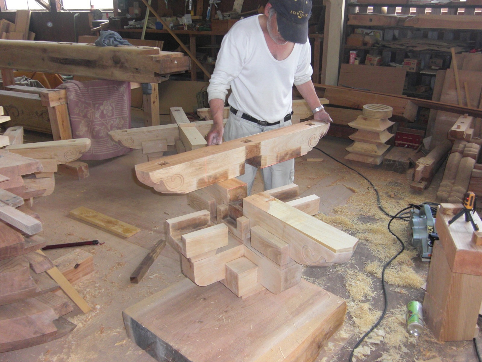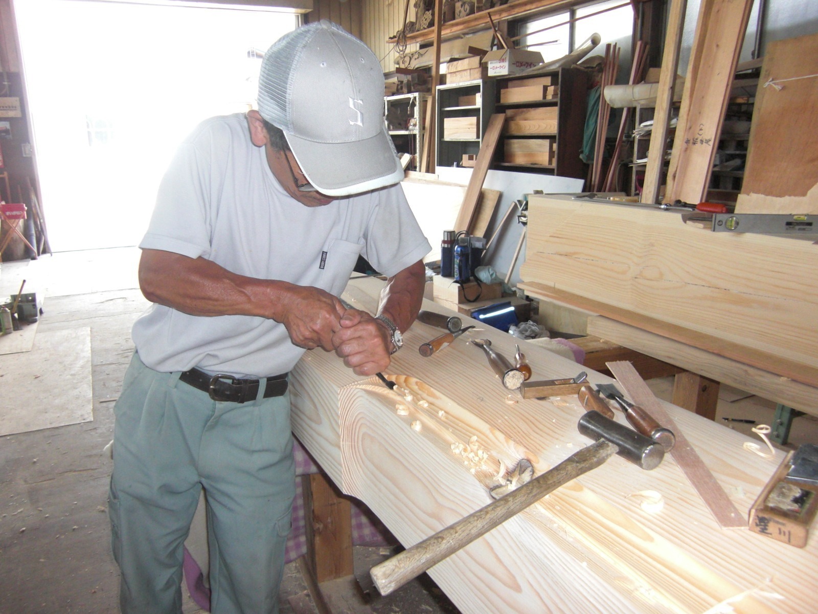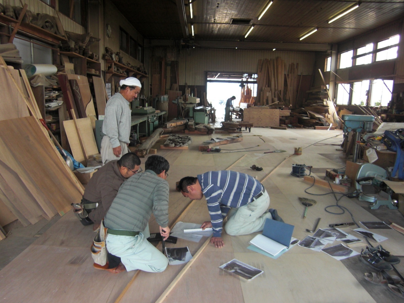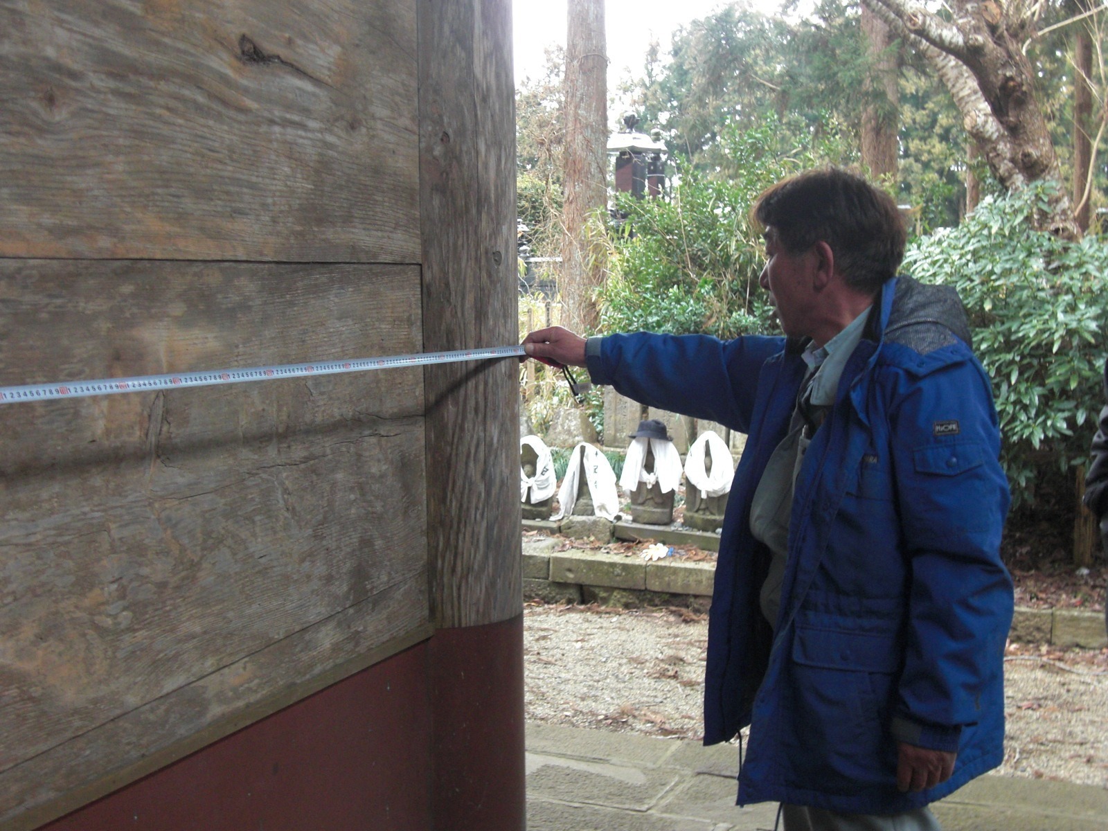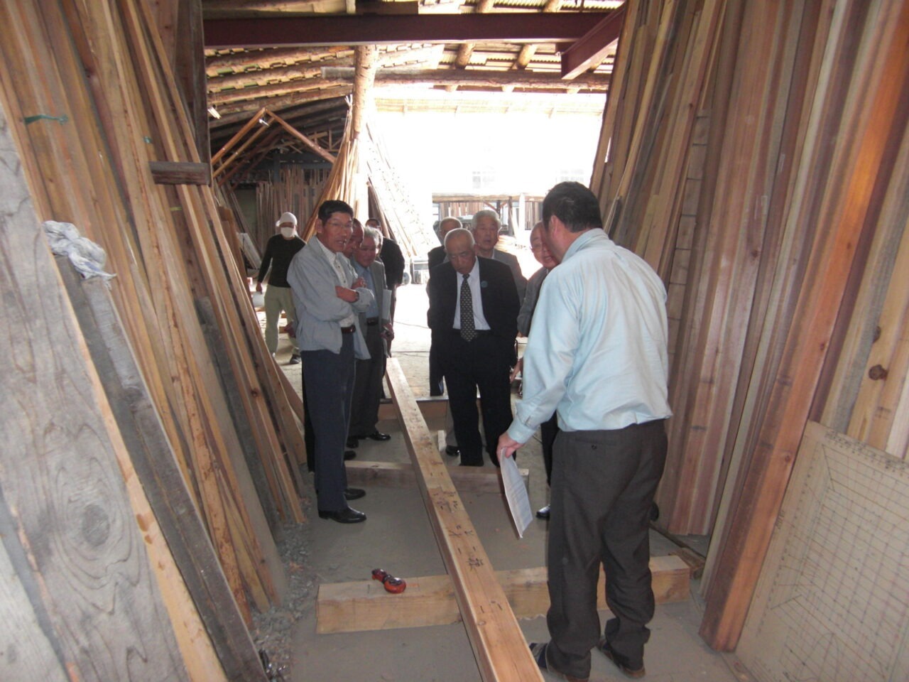 弊社資材置き場にて、ご住職、建設役員の方々と材料検査をおこないます。柱、虹梁に使う予定の木材を確認しています。加工の様子もご覧になりました。