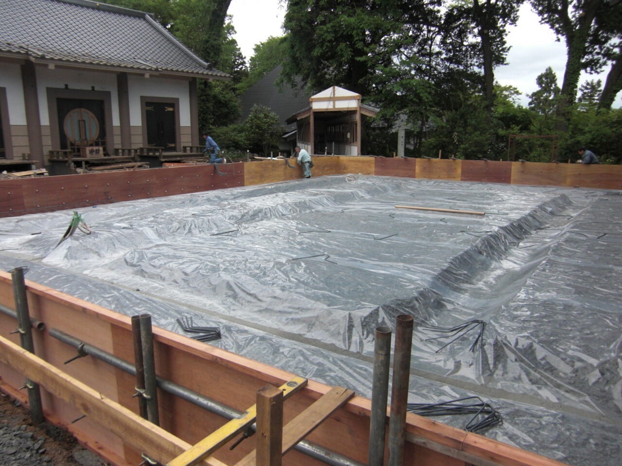 湿気防止のため、ポリフィルムを敷き詰め、基礎を流し込みました。