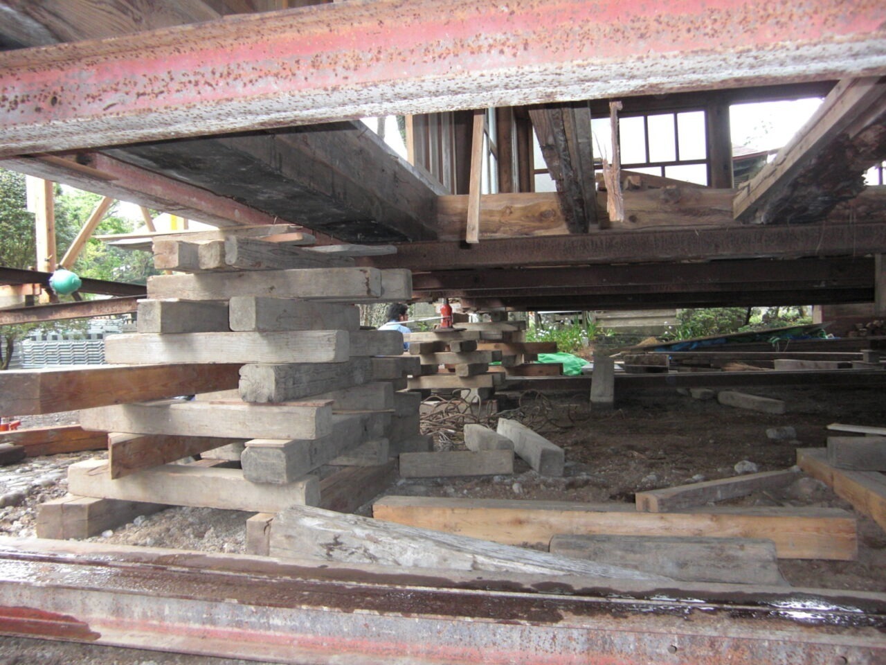 屋根瓦と向拝を解体したのちに、本堂本体の上舞(あげまい)工事をおこないます。土台を重量鉄骨で固定し、少しずつジャッキアップしていきます。枕木を重ねながら約1.8m持ち上げました。