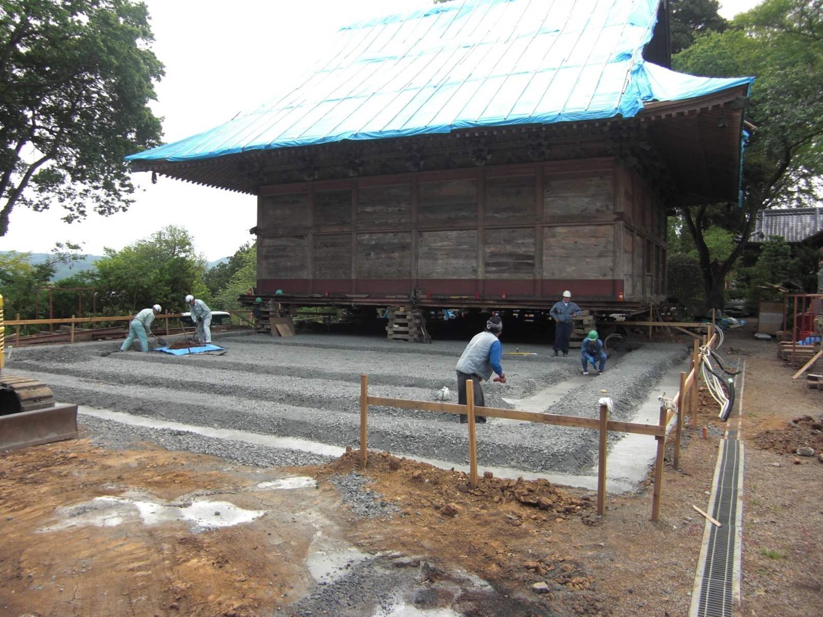 その後、本堂を前方へ約20m引っ張り出し、新しいベタ基礎の準備をします。基礎が完成した後で本堂を元の位置に戻します。