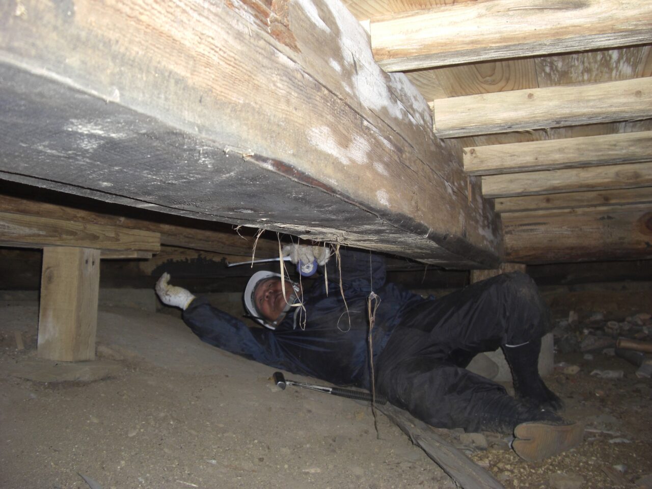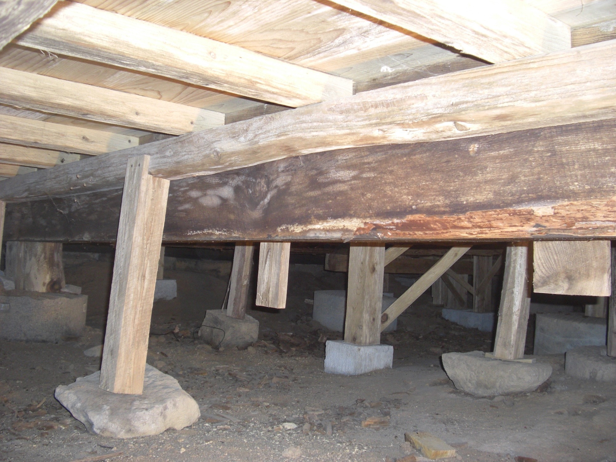 床下に入り土台の痛みを念入りに調べます。基礎が無く、天然の束石に柱が乗っている状態です。