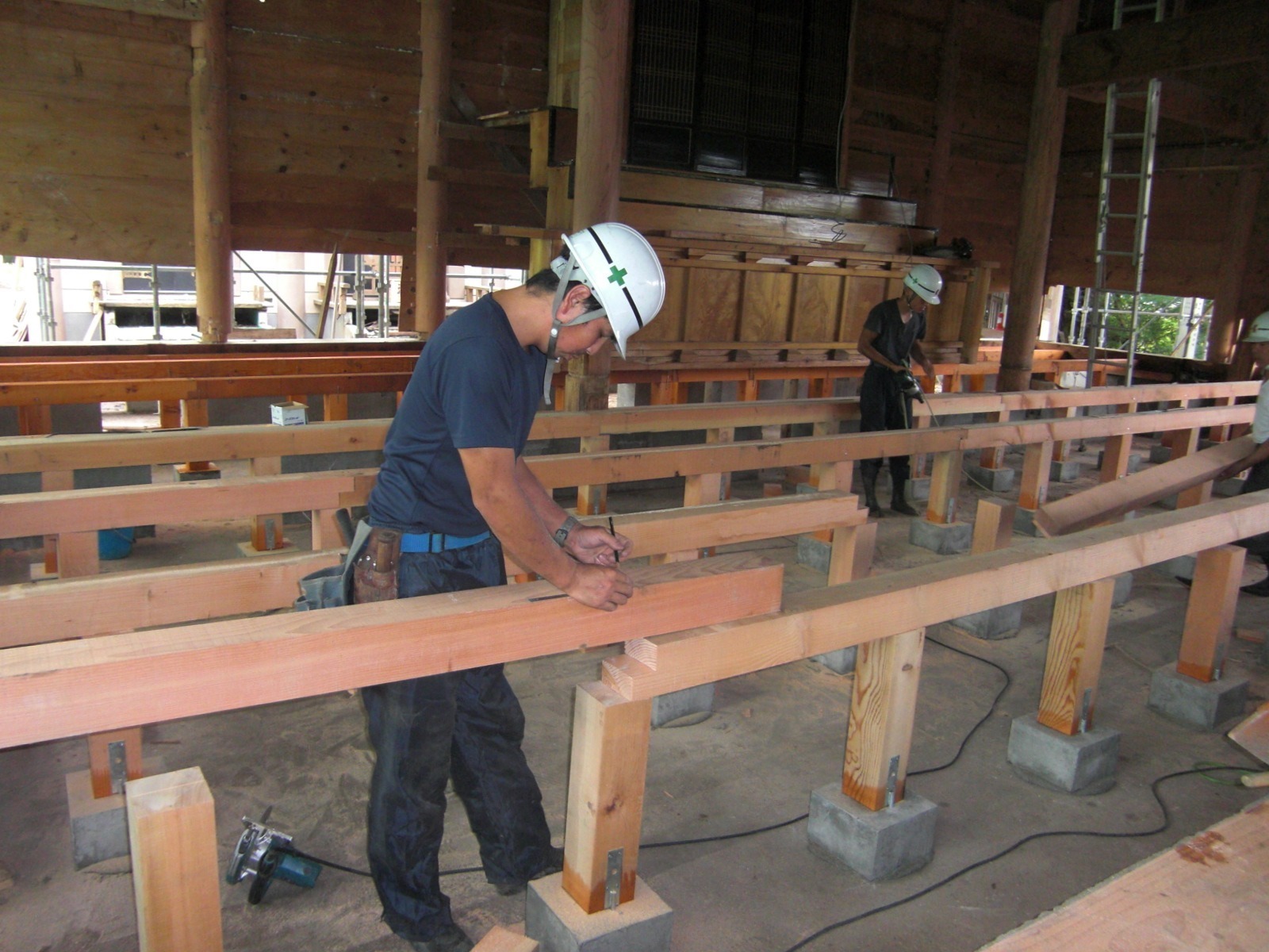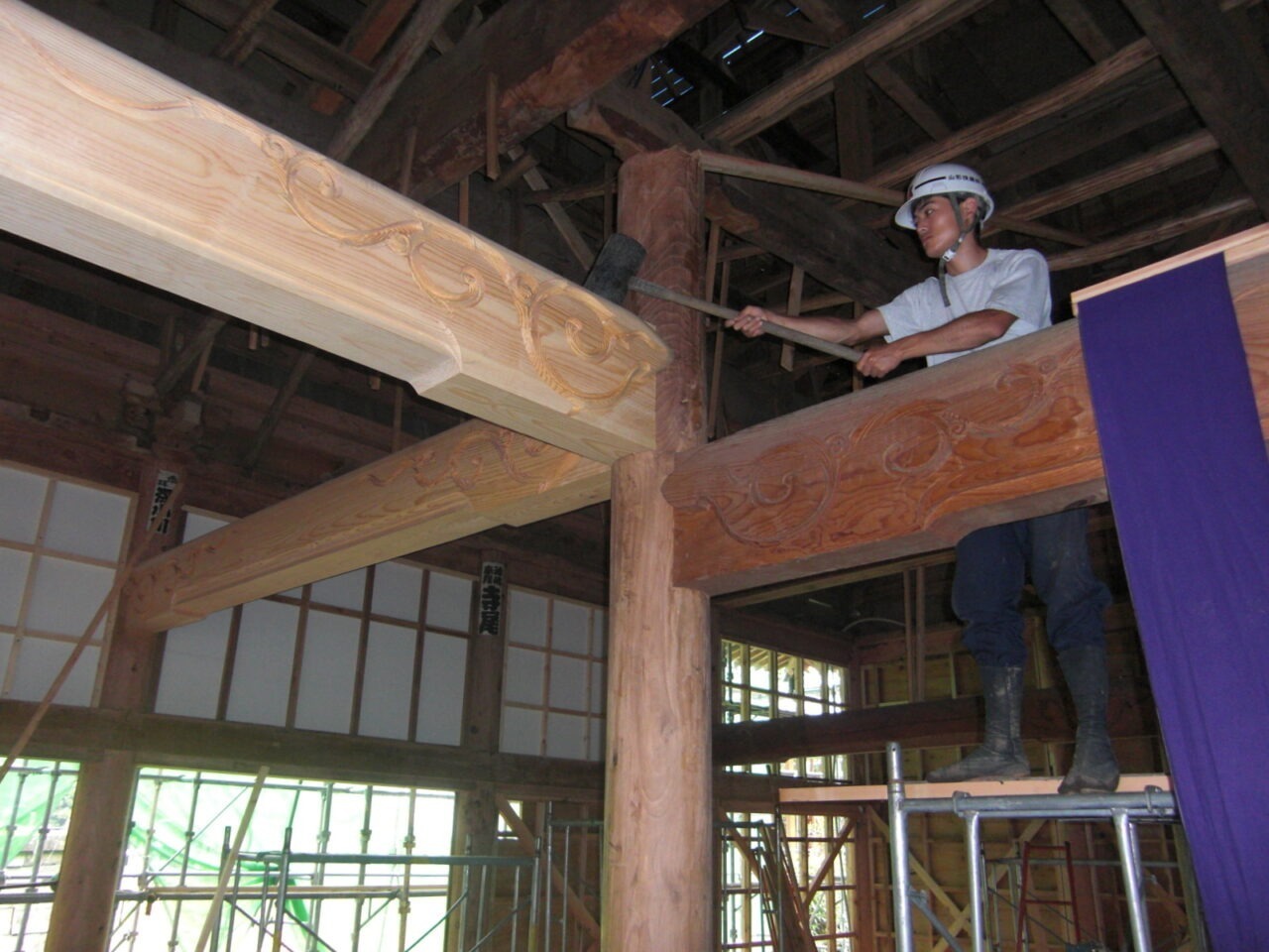 建物を補強し健全性を高めるための虹梁を新たに組み込みます。耐力壁も増設し、地震に強い『通し貫工法』を用いて施工しました。