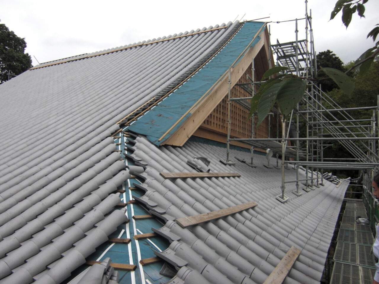 降り棟の施工状況です。完成間近の本瓦屋根です。銅板一文字葺きとはまた違った美しさがあります。