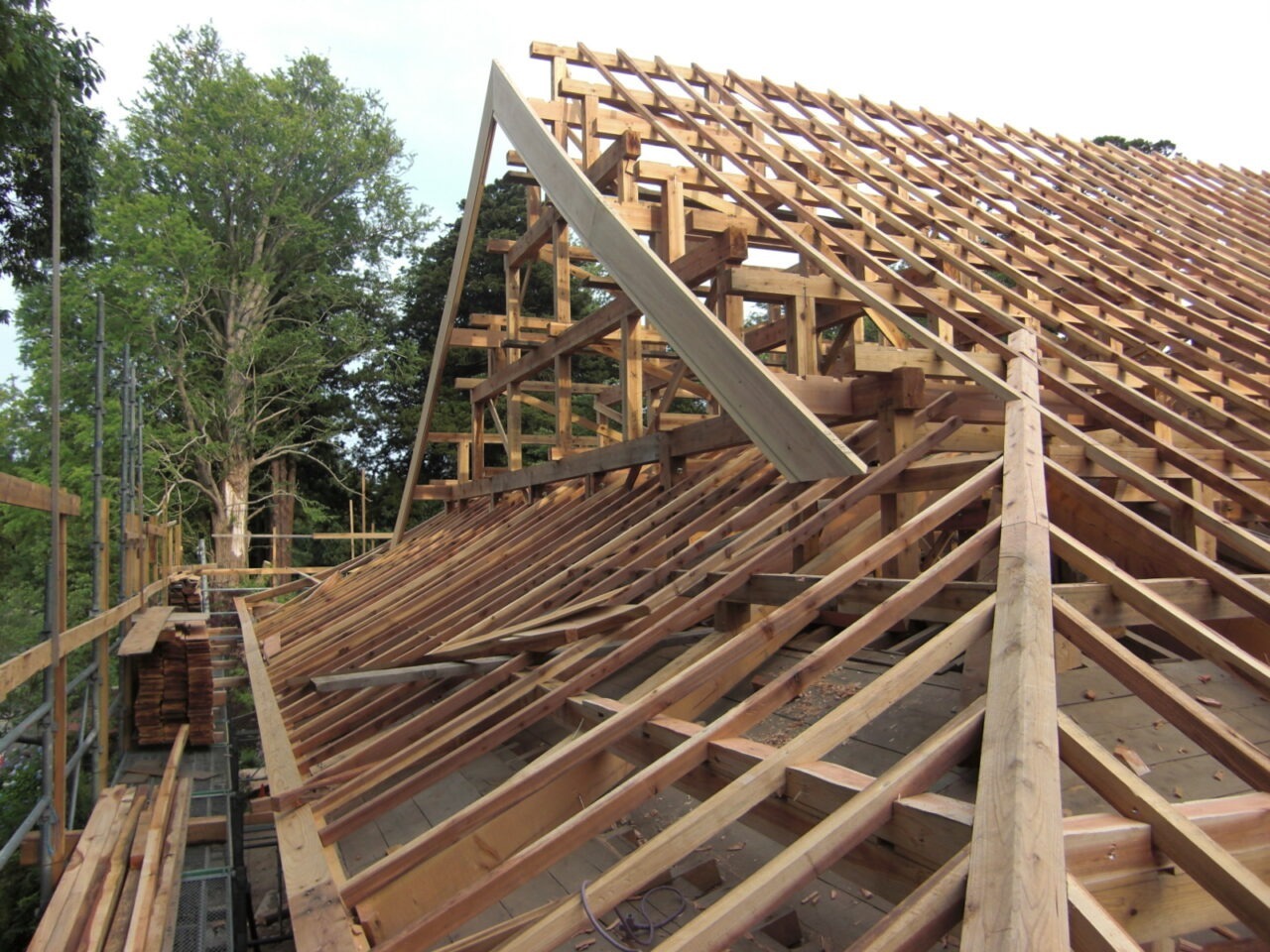 新規屋根下地を造作しています。新規床下地を造作しています。建物を補強し健全性を高めるための虹梁を新たに組み込みます。耐力壁も増設し、地震に強い『通し貫工法』を用いて施工しました。